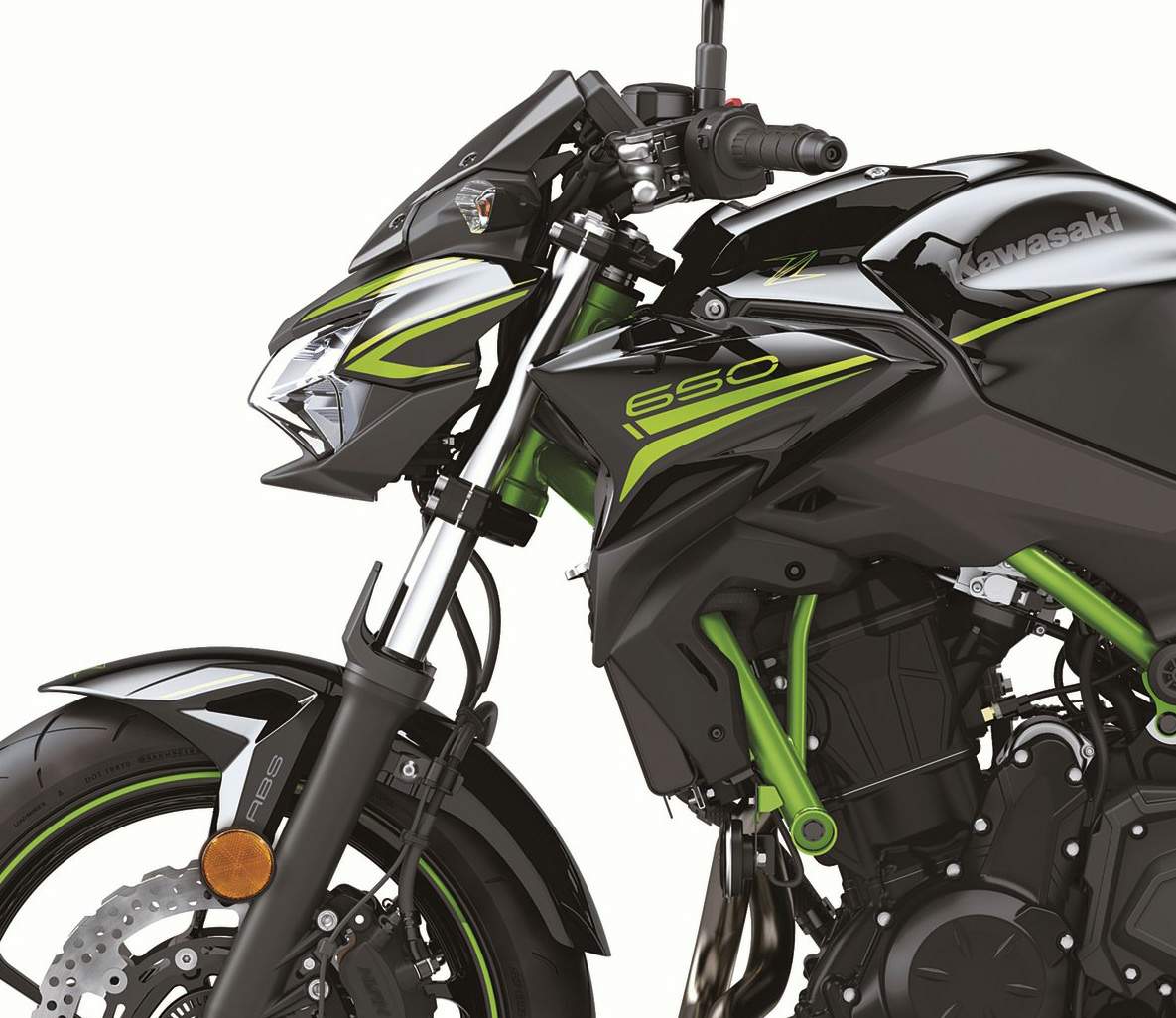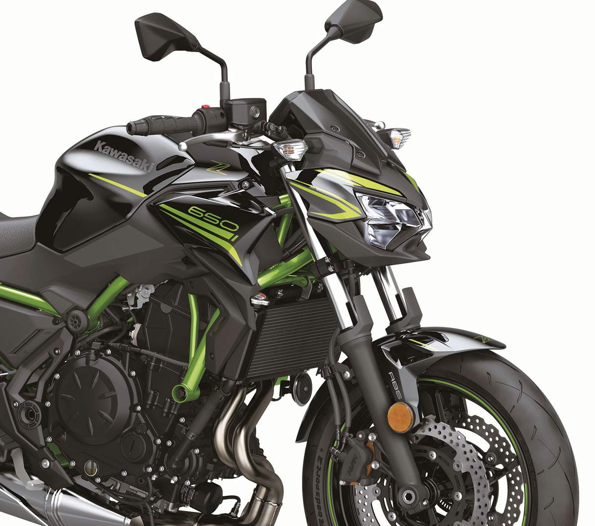 En la parte delantera de la Z650, el nuevo faro LED compacto se complementa con una luz de posición LED ubicada en el centro. Los bordes bien definidos acentúan el diseño del nuevo faro. La cubierta del faro es más nítida y densa, con un diseño único de dos piezas que fija las partes de colores más altos para crear una imagen luminosa. El alerón de mentón angosto, la nueva cobertura de medidores y las líneas más inclinadas mejoran el diseño y la apariencia de Sugomi. Complementando el nuevo aspecto frontal se encuentra el diseño limpio y funcional de las nuevas tapas anchas y las tapas de los radiadores que incorporan la imagen intensa y estilizada de Sugomi.