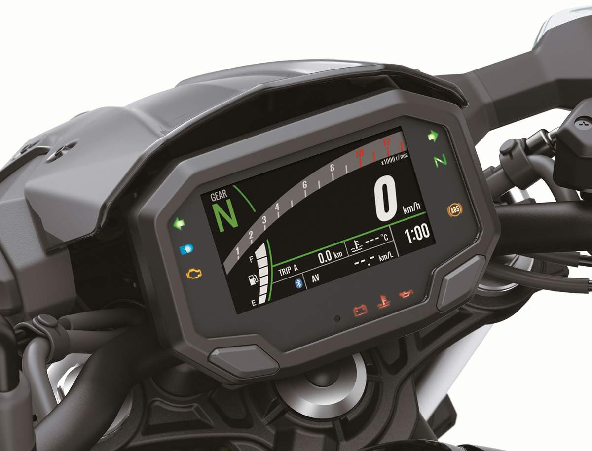 La nueva instrumentación a color de cartucho TFT totalmente digital de 4.3 “le da a la cabina de la motocicleta Z650 un aspecto de alta tecnología y alto grado. La pantalla a todo color de la tecnología TFT (transistor de película delgada) proporciona un alto nivel de visibilidad. El color de fondo de la pantalla puede (blanco o negro), y el brillo de la pantalla se ajusta automáticamente para adaptarse a la luz disponible. Las funciones de la pantalla incluyen: velocímetro digital, tacómetro digital estilo barra, indicador de posición de marcha, luz de cambio, indicador de combustible, odómetro, medidor de viaje doble, Consumo de combustible promedio y actual, autonomía restante, velocidad promedio, tiempo total, temperatura del refrigerante, reloj, voltaje de la batería, recordatorio de servicio de Kawasaki, recordatorio de cambio de aceite e indicador de conducción económica.