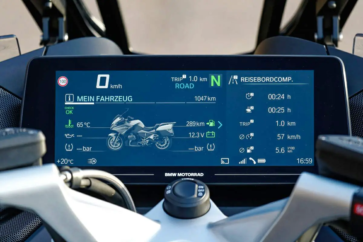 La nueva R 1250 RT está equipada con una pantalla a color TFT de 10,25 pulgadas con conectividad y navegación por mapas integrados. Su excelente legibilidad, la clara navegación por los menús y el concepto operativo altamente integrado colocan a la nueva R 1250 RT en la parte superior de la gama de motocicletas de producción en serie. Por primera vez en una motocicleta, la nueva pantalla a color de 10,25 pulgadas permite mostrar un mapa de navegación en el cuadro de instrumentos, por lo que no se requiere una pantalla adicional.