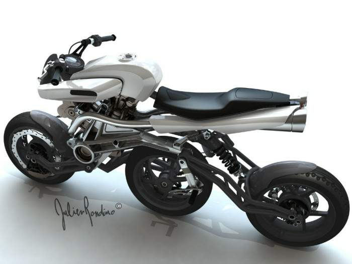 La solución de Rondinaud utiliza un motor KTM Super Duke inverso y tres ruedas de 14 pulgadas para crear una huella de neumático un 50 % más grande. Las dos primeras ruedas están muy juntas para brindar agilidad, mientras que la tercera rueda de oruga agrega estabilidad. Las tres ruedas usan brazos oscilantes y unidades de suspensión independientes, y frenos de un solo disco. Pero para entender cómo funciona hay que profundizar un poco más.