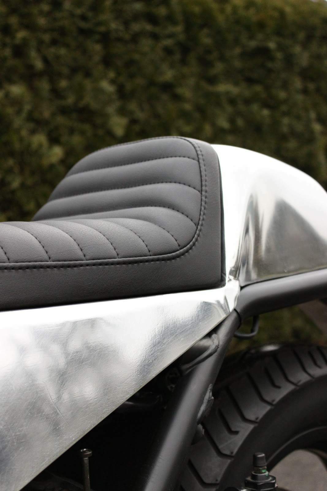 Así es como solía llamar a la bicicleta durante el proceso de construcción. Michael ganó todas las ferias que le gustaban y fabricó piezas nuevas para sí mismo con aluminio, como los guardabarros o la parte trasera. Como no quería dejarlo todo desnudo añadió otro carenado al estilo Ducati/Imola y así se topó con la pintura plateada, también negra en la mitad inferior, en la mitad superior. El motor es un gran punto de la moto, pero se ve mucho más delgado y rápido