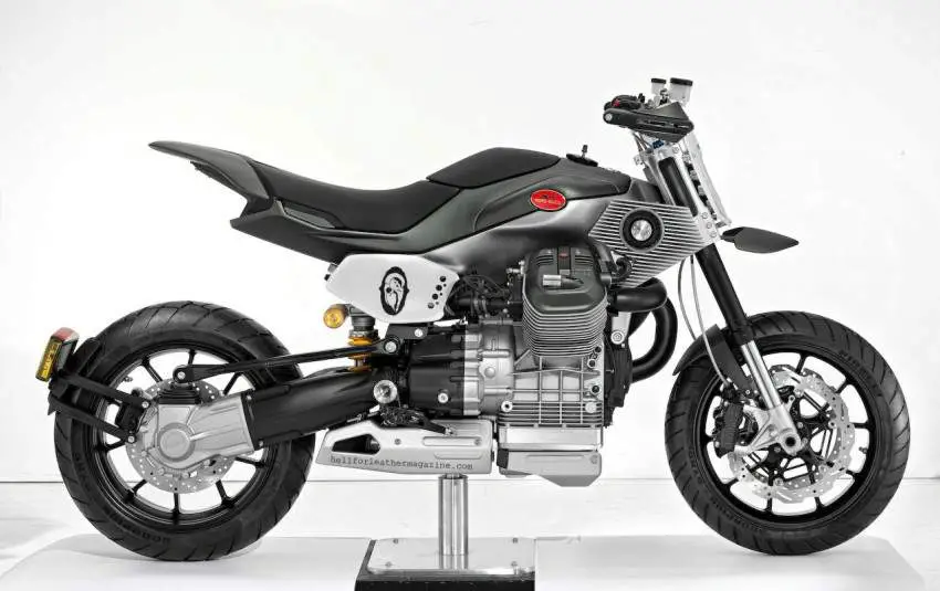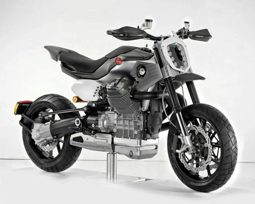 Los prototipos de Pierre Terblanche destacan por el diseño minimalista del bastidor de fundición de aluminio que incorpora el verdadero trabajo de esa mecánica. Las dimensiones compactas del marco crean un diseño simple y ordenado. El tanque, la silla y la cola están integrados en una estructura monocasco, un ejemplo inusual del arte del diseño que combina tecnología, estilo y practicidad. La impresión general es de una integridad sorprendente, una escena que no se ve en la industria de las motocicletas: no queda un solo cable a la vista, no hay un solo detalle que no sea una llave. Una apariencia tan impecable y un tamaño compacto no se habrían imaginado sin el diseño delgado del motor de dos cilindros Guzzi. Toda una paradoja, si se tiene en cuenta la personalidad exuberante de este motor.