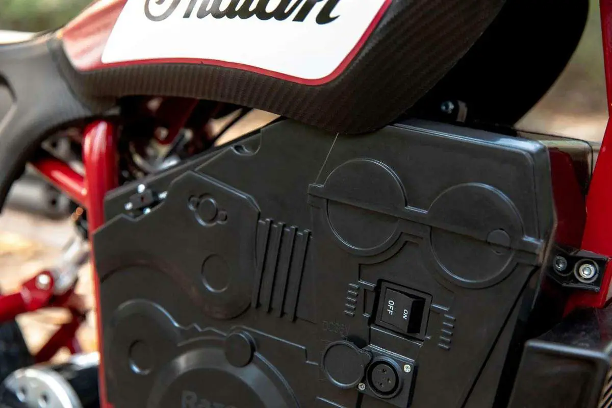 Trabajando en asociación con Razor USA, el equipo de desarrollo de productos de Indian Motorcycle diseñó el eFTR Jr en torno a un tren de potencia eléctrico Razor confiable y probado. La batería recargable de 36 voltios del eFTR Jr funcionará durante 140 minutos en modo bajo a 10 mph y 65 minutos en modo alto a 15 mph.