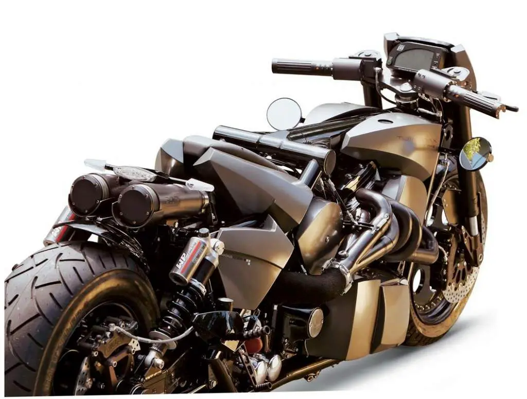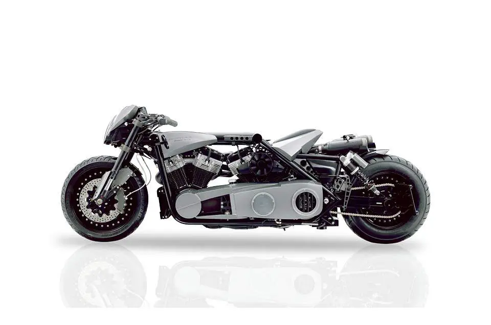 Cada uno de estos motores produce 80 CV y el peso total de la moto es de 400 kg, lo que significa que cada motor tira de un 40 % menos de peso que si estuviera sentado en una Harley original.