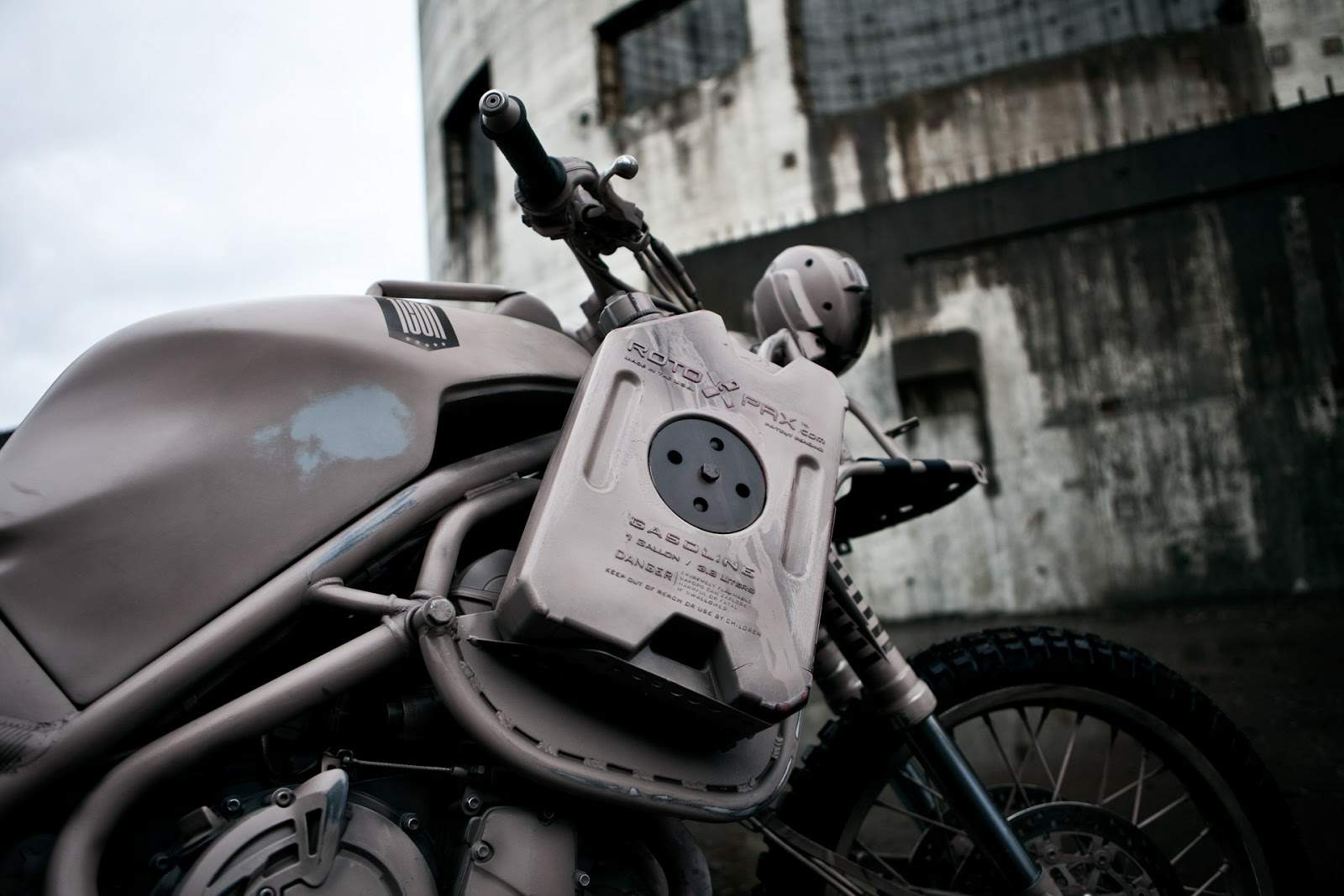 “En primer lugar, se ajustó con precisión el bastidor auxiliar trasero y se reemplazó un bastidor auxiliar personalizado. Se retiraron todas las reservas y hadas, y el tanque de combustible. Reemplazamos estos tanques hechos a mano de gran tamaño para aumentar el alcance y doblamos las cubiertas del radiador como jaulas de choque. Se agregaron varios bastidores de servicios públicos, las unidades de stock se reemplazaron con luces LED PIAA y se agregaron celdas de combustible duales RotoPax para un alcance aún mayor. Se agregaron un nuevo par de Continental TKC80, así como un escape de montaje alto Leo Vince y una suspensión reelaborada Ohlins. Para completar la construcción, la Dromedarii fue lacada en color marrón desierto completo y los tubos de la horquilla recibieron tiras de invasión ICON1000”.