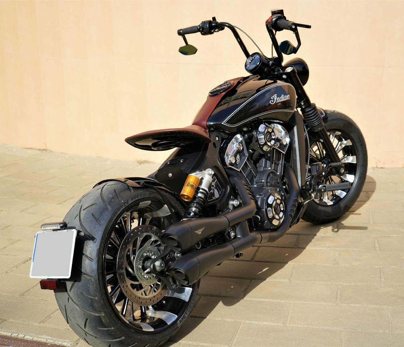 Se trata de la tercera Indian Scout modificada por Lord Drake Kustoms, que empieza a consolidarse como una de las más destacadas empresas de customización de motos de la India y, sobre todo, especializada en la instalación de un dispositivo de rueda ancha en estos nuevos modelos de la marca india. .