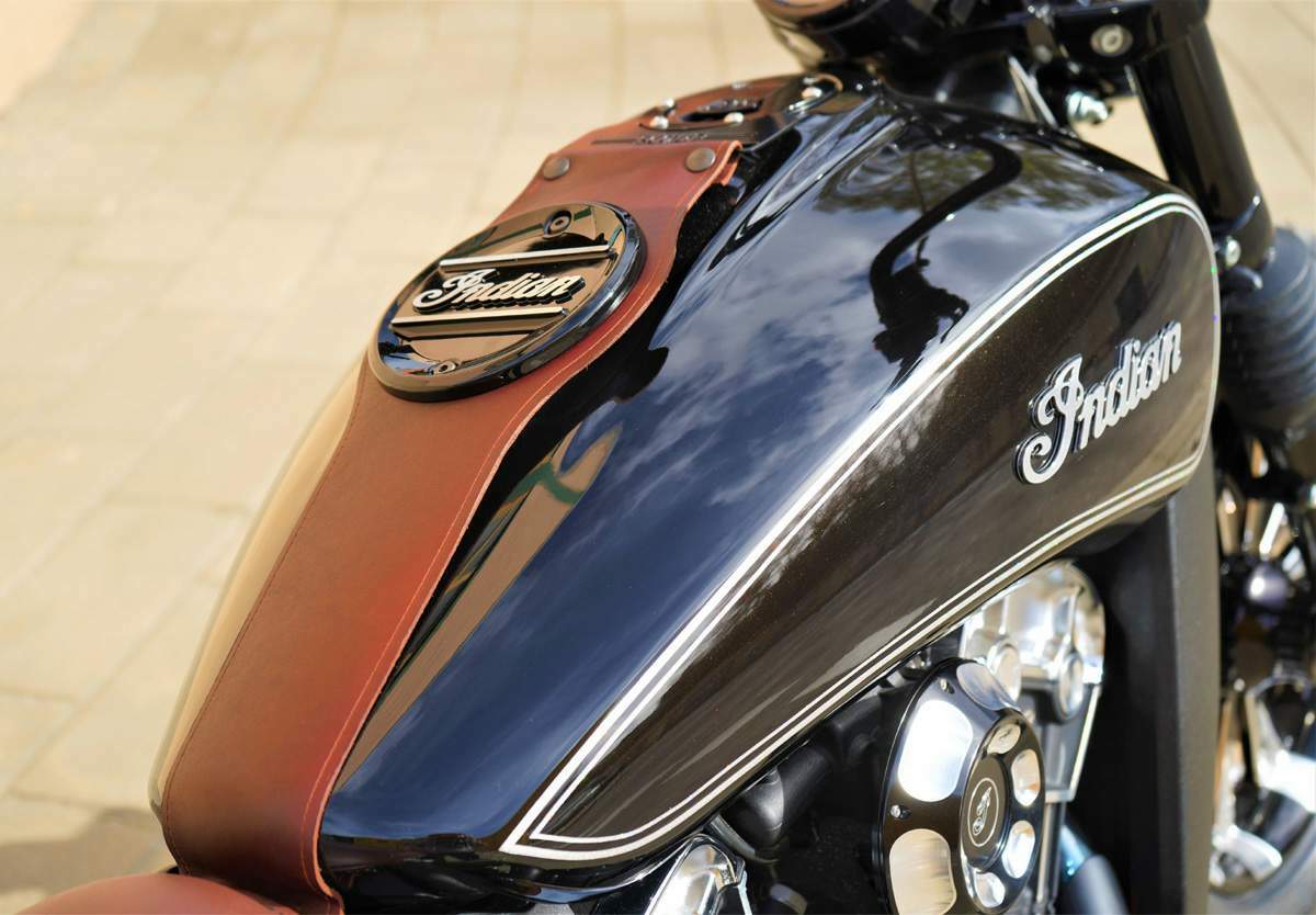 Dos tipos de negro se combinan en una pintura de moto tan distintiva: Negro brillo para las zonas exteriores de las líneas y negro perla para el interior. Todo el pinstriping y el logo de MJ se pintaron en plata con purpurina de colores para conmemorar el brillo de los guantes con pedrería que llevaba el cantante… y que lleva esta “Indian Scout 240 Bobber BAD”.
