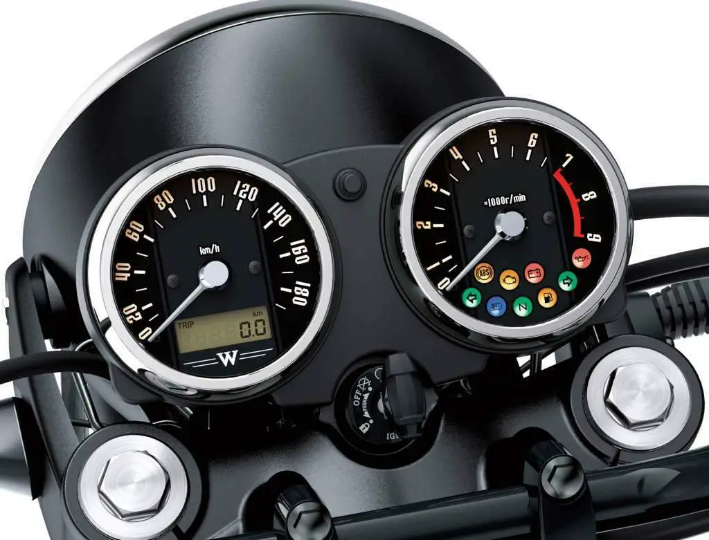 El W800 Street está equipado con instrumentación tradicional, que incluye un solo velocímetro y un tacómetro con una pantalla clásica. Una pantalla LCD multifuncional incorpora un cuentakilómetros, cuentakilómetros parcial y reloj. La gama completa de luces indicadoras incluye: luz de advertencia FI, indicadores de señal doble verde, indicador de bajo nivel de combustible, indicador de luz alta, indicador de punto muerto y luz de advertencia de presión de aceite. Un interruptor compacto, diseñado para agregar un toque vintage, le da al manubrio una apariencia liviana que no se afeita, pero debajo del exterior de estilo retro, los interiores modernos aseguran el desempeño confiable del W800 Street.