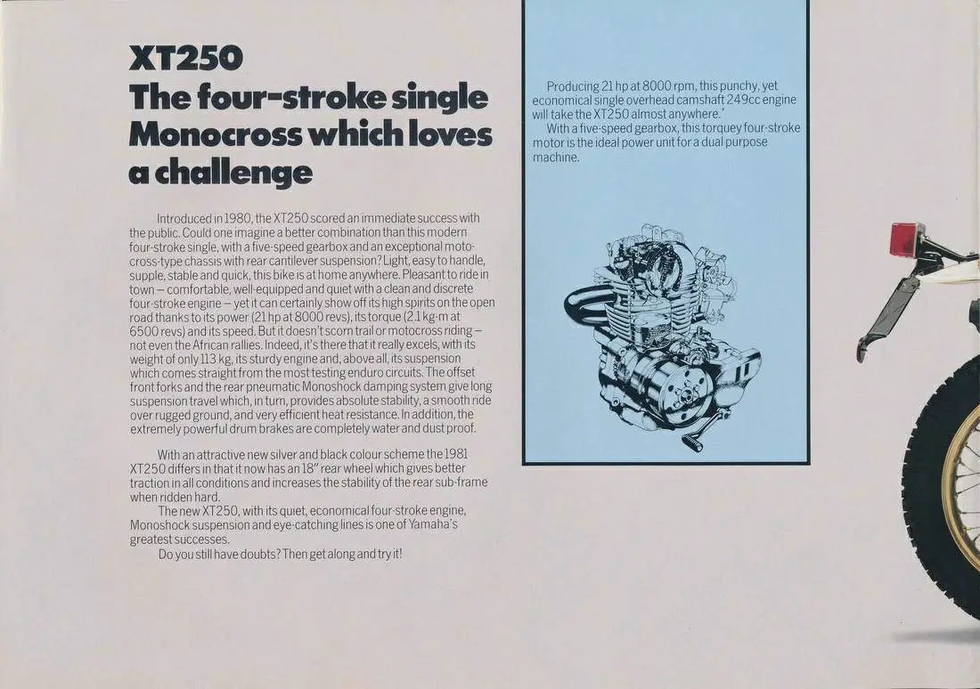 Toda la atención puesta en el peso ligero y el par dio sus frutos, la respuesta predecible del motor XT, que maneja su trabajo en la calle tan bien como la mayoría de los 250 de calle por sí solo. El XT se puede mover fácilmente mientras está en el tráfico, y una bomba de acelerador de grafito en la carpa Mikuni de 28 mm le garantiza que podrá progresar la mayor parte del tiempo. Y para aquellos que esperan con ansias el excelente laboratorio, la suspensión bien combinada y el motor de funcionamiento suave ofrecen velocidades alcanzables en el mundo real, sin la vibración y la masa y el tejido asociados con la mayoría de las bicicletas.